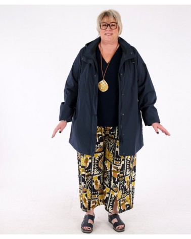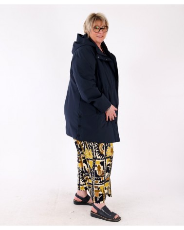 The detachable hood has a contrasting wide string with a nice print. The drawstring is matching the black accessories.