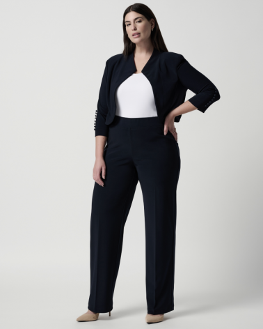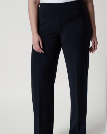 Le pantalon noir mi-haut de Joseph Ribkoff présente un style à jambe large, des plis et une taille élastiquée. La ligne droite de la jambe allonge l'aspect des jambes de l'avant et est faite d'un mélange de polyester et de spandex.