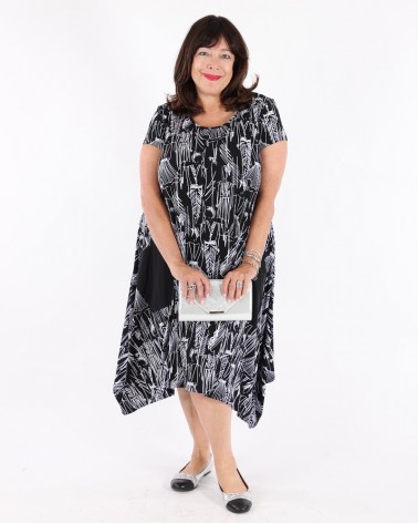 Chef-d'œuvre unique en son genre, cette robe en tricot soyeux impressionne en toute occasion. Un imprimé conversationnelle captivant orne le tissu, conférant au vêtement un aspect audacieux. L'encolure arrondie et les manches courtes complètent la silhouette cocon légère, alors que les poches sur le devant harmonisent le style et la commodité de ce vêtement rare.