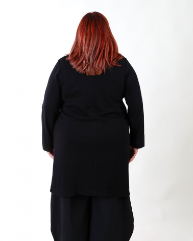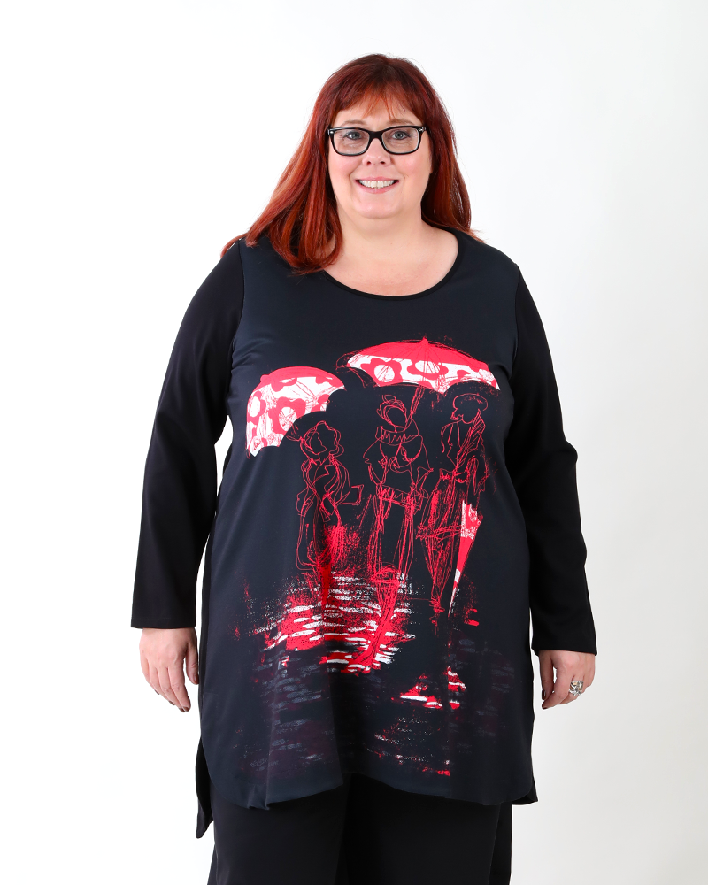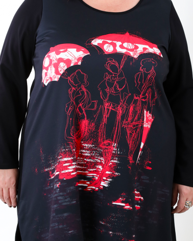 Longue tunique courte noire avec imprimé, illustrations de femmes avec des parapluies.