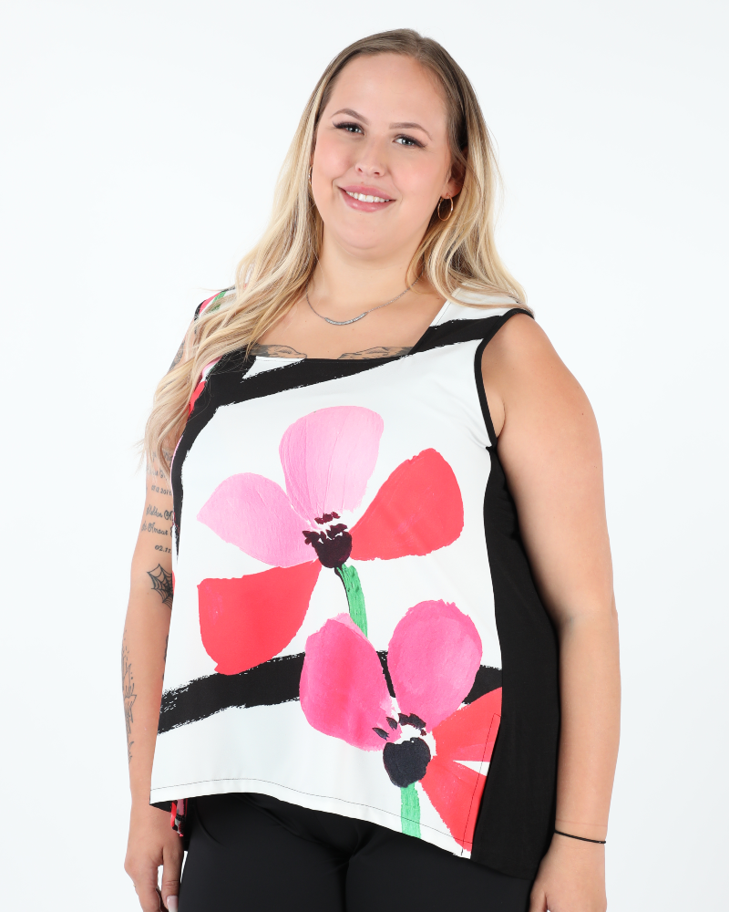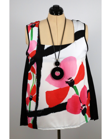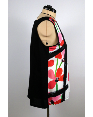 Présentant un débardeur noir et blanc chic et tendance, orné d'un charmant éclat de motifs imprimés de fleurs roses et rouges. Ce vêtement élégant combine sans effort la simplicité classique avec une touche de grâce ludique. La base contrastée en noir et blanc crée une fondation intemporelle, permettant au motif floral vibrant de briller vraiment.